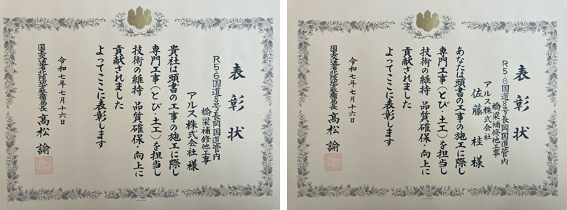 ■令和7年分「国土交通省 北陸地方整備局 令和6年度完成優良工事における令和7年度下請負者局長表彰を受賞しました。」